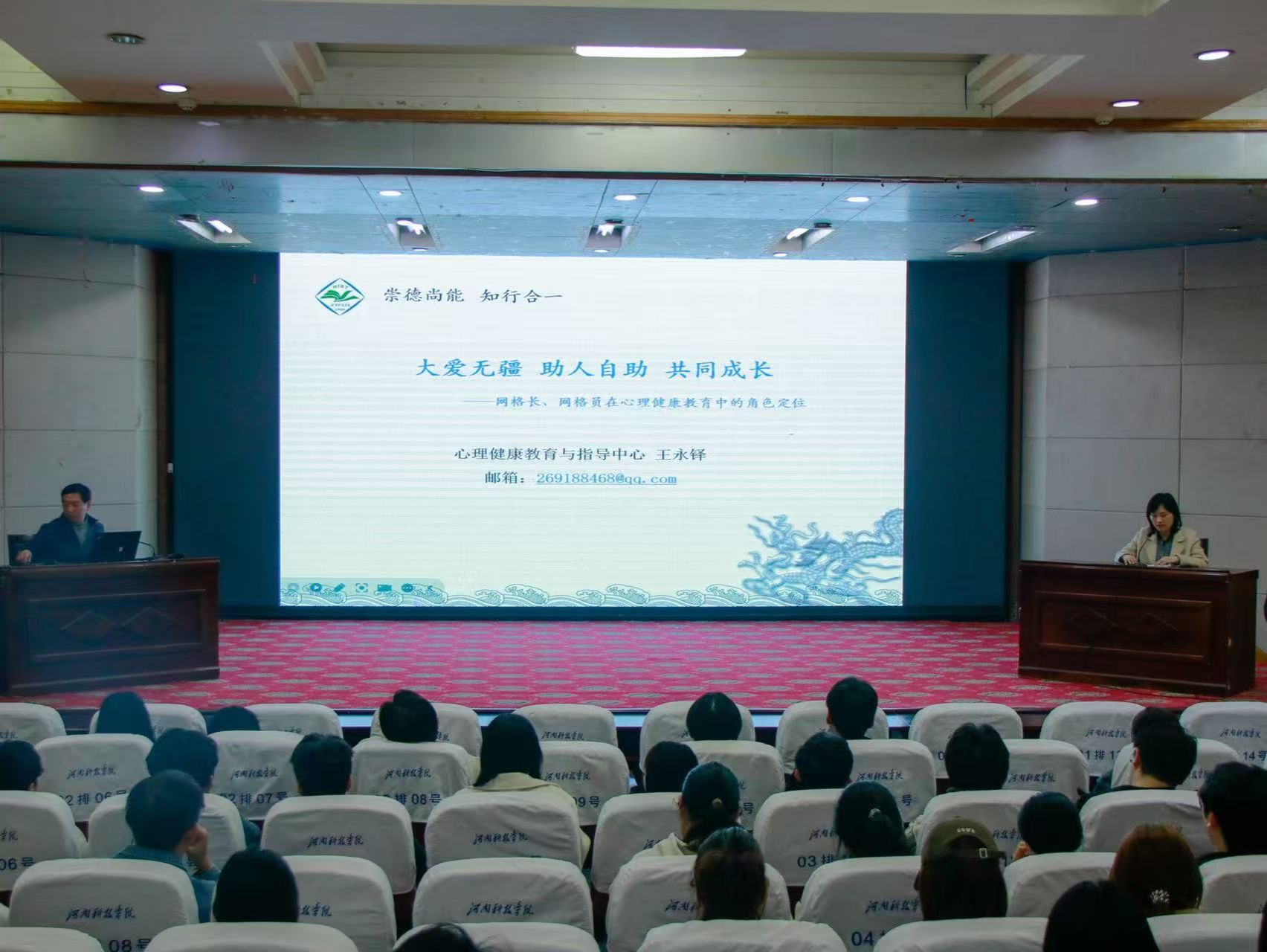 培训特邀学校心理健康教育与咨询中心主任王永铎作专题授课,王永铎以“大爱无疆 助人自助 共同成长”为主题,结合实际案例讲解常见心理疾病的识别方法与应对策略,明确了宿舍长在学生心理健康关怀中,开展早期识别、情绪支持和引导专业求助的关键作用。